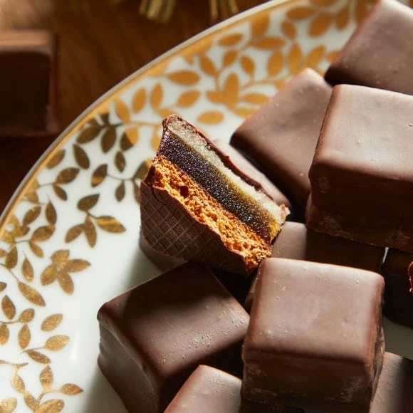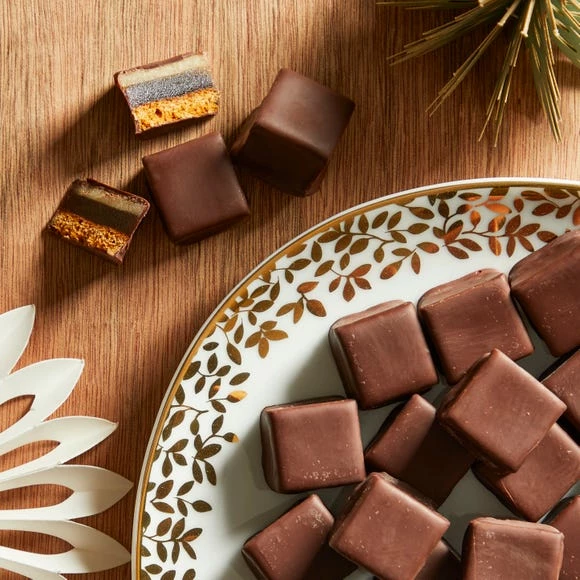 These gingerbread bites have been beautifully presented in hand illustrated designs and hand finished with a bow and tag for the perfect gift. Crafted in the heart of the Staffordshire Moorlands by master continental bakers, these gingerbread bites feature layers of traditional German Lebkuchen topped with layers of apricot puree and almond paste, enrobed in thick dark chocolate.