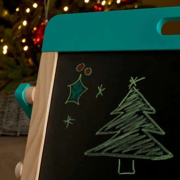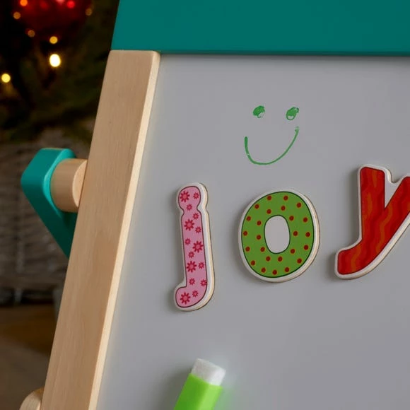 This 2 in 1 Wooden Easel is great for encouraging art and learning with the little ones. Made of high quality solid wood and MDF and finished with non-toxic paint, this easel is great for all day play. This tabletop easel easily folds back and has a chalkboard side and a whiteboard side. Including 26 magnetic alphabet letters, this easel develops both creativity and language ability.