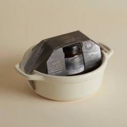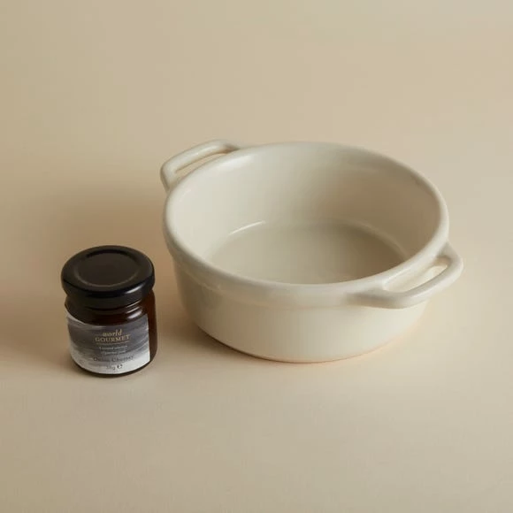 This cheese baker is a round ceramic bowl. Designed to fit a whole round of cheese such as brie or Camembert, it also works with other cheeses such as feta, mozzarella, goat cheese, ricotta, blue cheeses, and more. A cheese baker allows you to conveniently store, transport, bake and serve cheese.