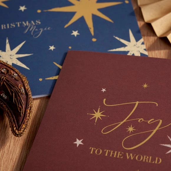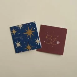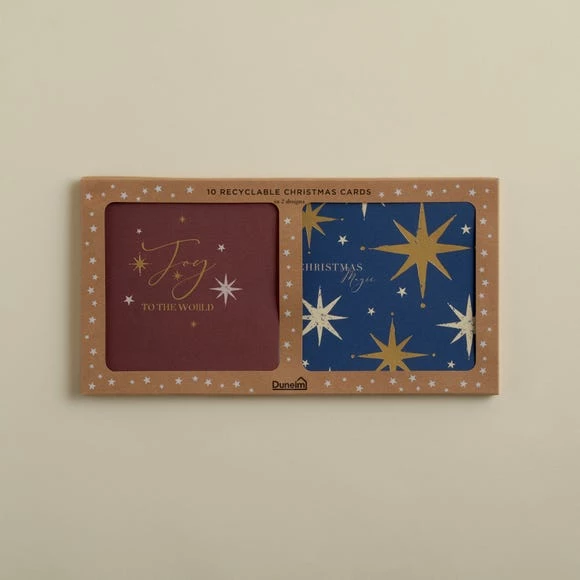 These cards feature traditional colours and gold foil, with a Christmas text design and gold stars design. Message inside reads: Wishing You a Very Merry Christmas. These cards are fully recyclable.