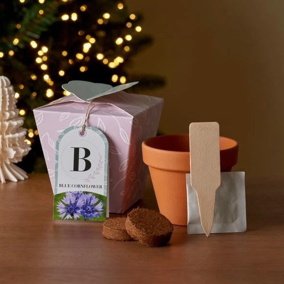 - Includes carton with monogram tag, 8cm terracotta pot, compost pellets, wooden plant marker, and seeds
