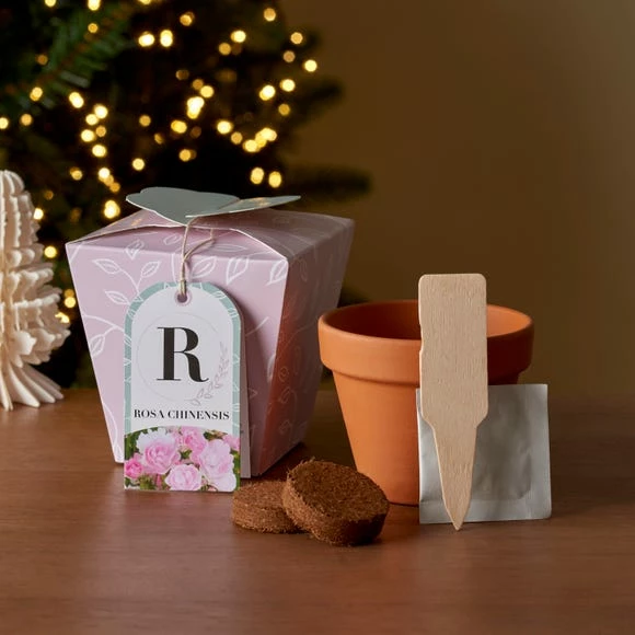 - Includes carton with monogram tag, 8cm terracotta pot, compost pellets, wooden plant marker, and seeds