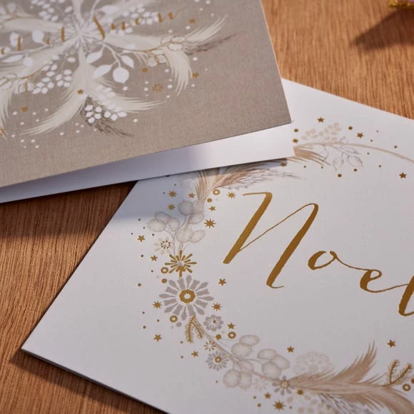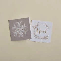 These cards feature lovely white, beige and gold colours with gold foil that give them an elegant look, one has a foliage design and the other has a wreath design. Message inside reads: Merry Christmas. These cards are fully recyclable.