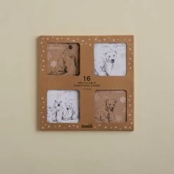 These cards come in a pack of 16 with 4 designs each (4 cards per design) and feature cute polar bear designs. Message inside reads: Merry Christmas. These cards are fully recyclable.
