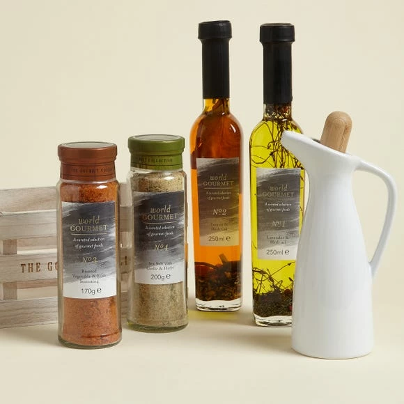 | Pack Contents | Lavender & Herb Oil 250ml, Lemon & Herb Oil 250ml, Roasted Vegetable & Fries Seasoning 170g, Sea Salt with garlic & Herbs 200g, Pouring Jug, Storage Box |
