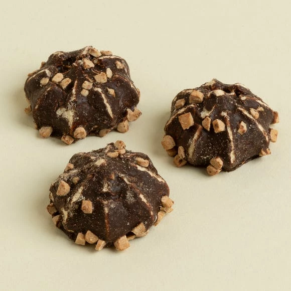 These Salted Caramel Meringue Kisses have been beautifully hand crafted in the heart of the Staffordshire Moorlands by master continental bakers. Crumble over a dessert, use in baking, or enjoy on it’s own. These merengues are enrobed in a chocolate flavour coating and sprinkled with salted caramel nibs.